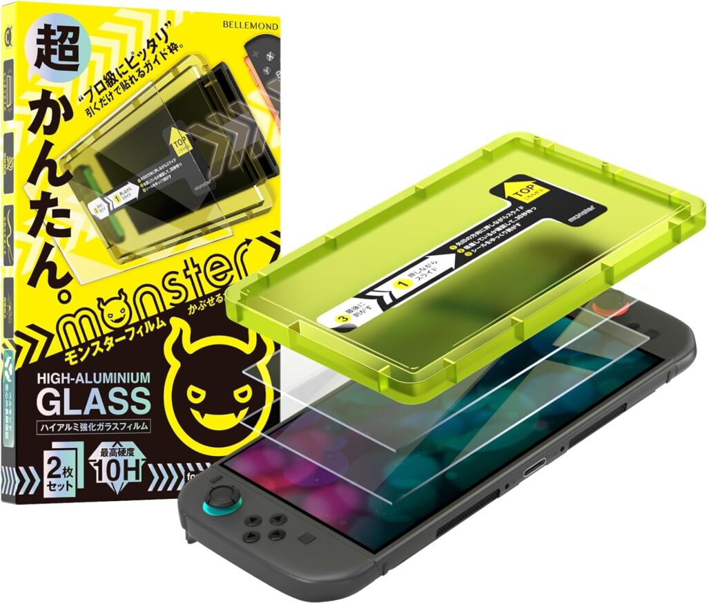 ベルモンド Switch2 保護フィルム B1510」は簡単ガイド枠付きで失敗しにくい設計のスイッチ2用画面割れ防止強化ガラスです。